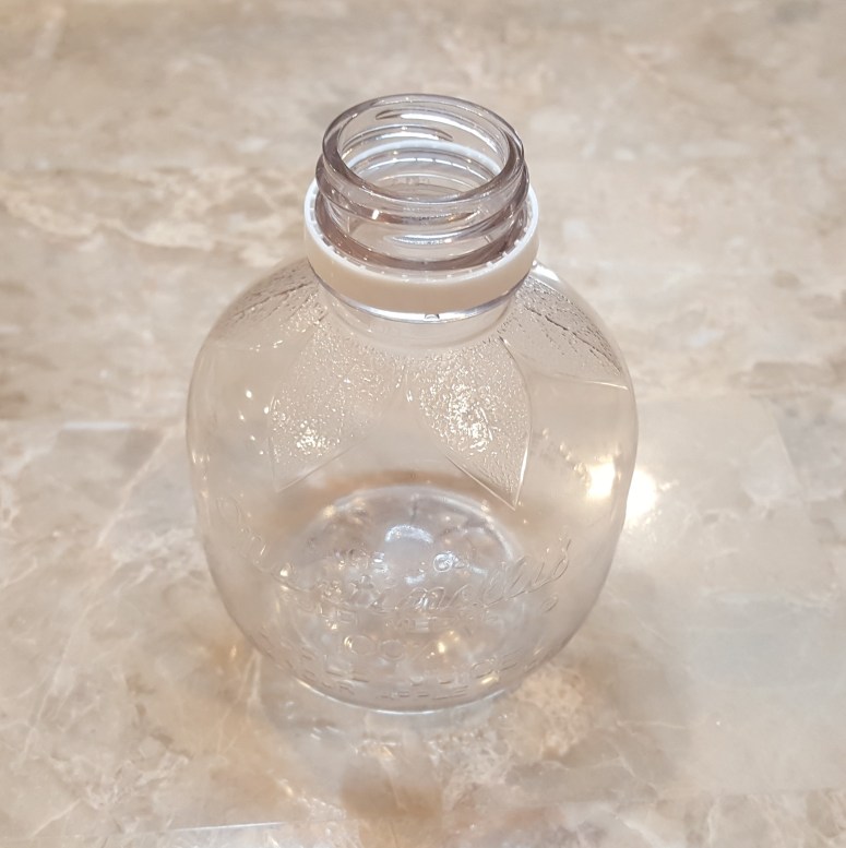 Next, you can grab your empty bottle. Slice the top off with your knife, or a bread knife. My dad helped me burn the sides of the opening so that it smoothens out, but that’s optional. When you are done add water.